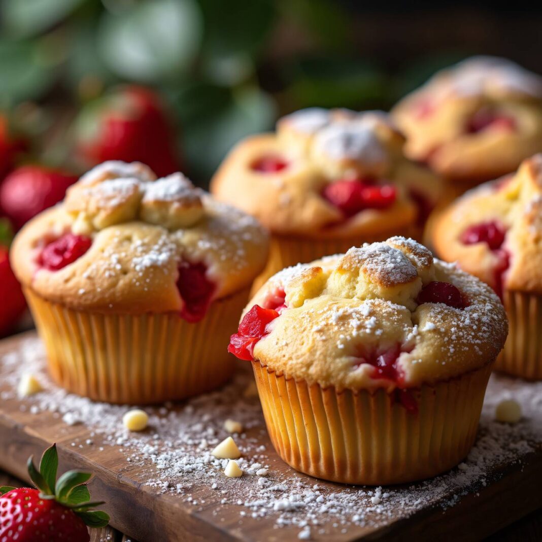 Saftige Muffins mit frischen Erdbeeren und zarter weißer Schokolade, perfekt für jeden Anlass.