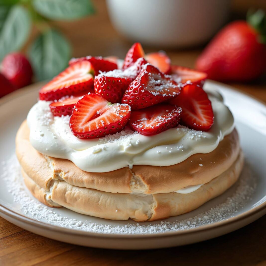 Ein köstliches Dessert mit einer knusprigen Baiser-Hülle, gefüllt mit steif geschlagenem Schlagobers und frischen Erdbeeren.