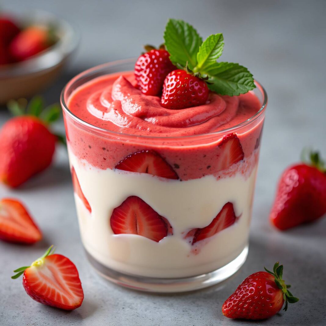 Eine köstliche Erdbeercreme mit Mascarpone, die perfekt als Dessert geeignet ist.
