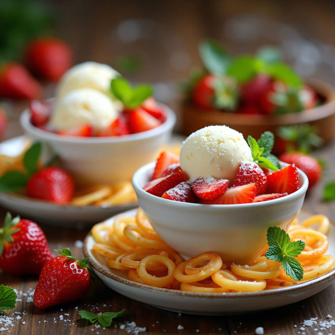 Ein köstliches Dessert aus marinierten Erdbeeren, cremigem Vanilleeis und knusprigen Pfeffer-Biskuits.