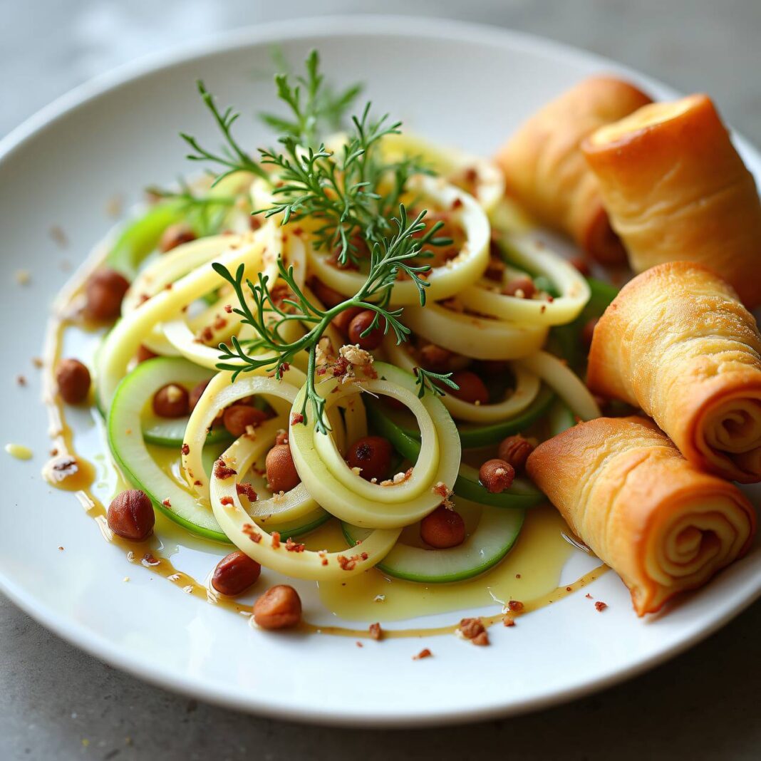 Ein erfrischendes Fenchel-Carpaccio mit knusprigen Strudelteig-Röllchen und einer aromatischen Sauce.