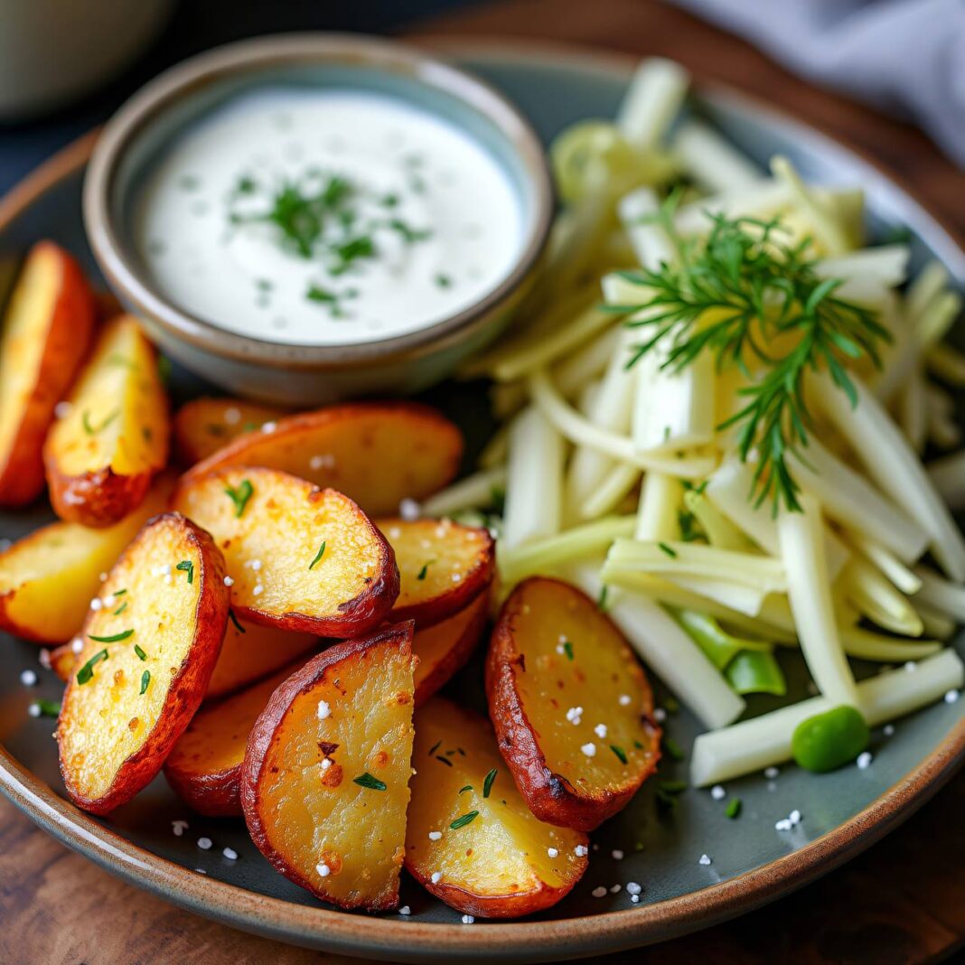 Ein erfrischender Fenchelsalat kombiniert mit knusprigen Wedges und einem cremigen Topfen-Dip.