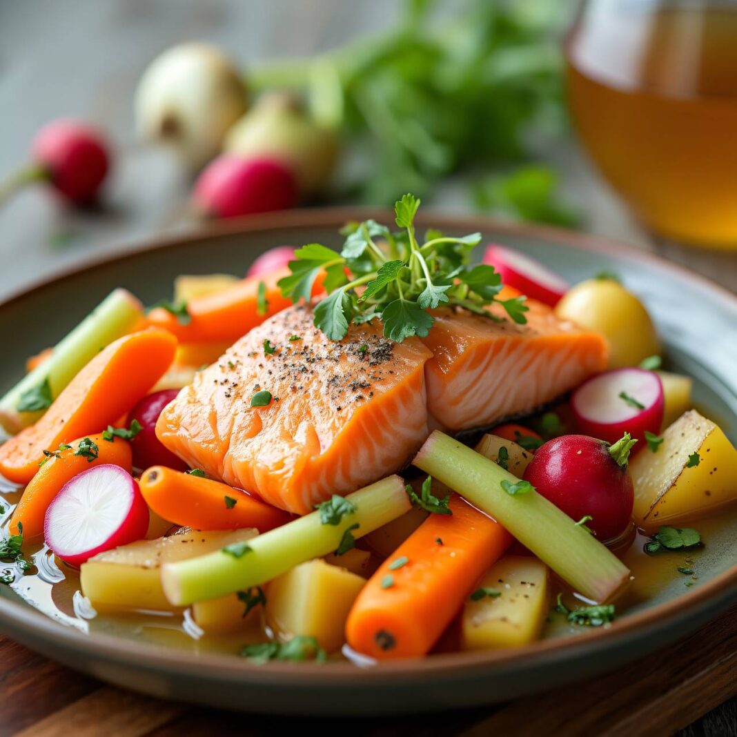 Ein köstlicher Fisch-Gemüse-Topf mit Lachsforellenfilets, gemischtem Gemüse und Kartoffeln, ideal für eine leichte Mahlzeit.
