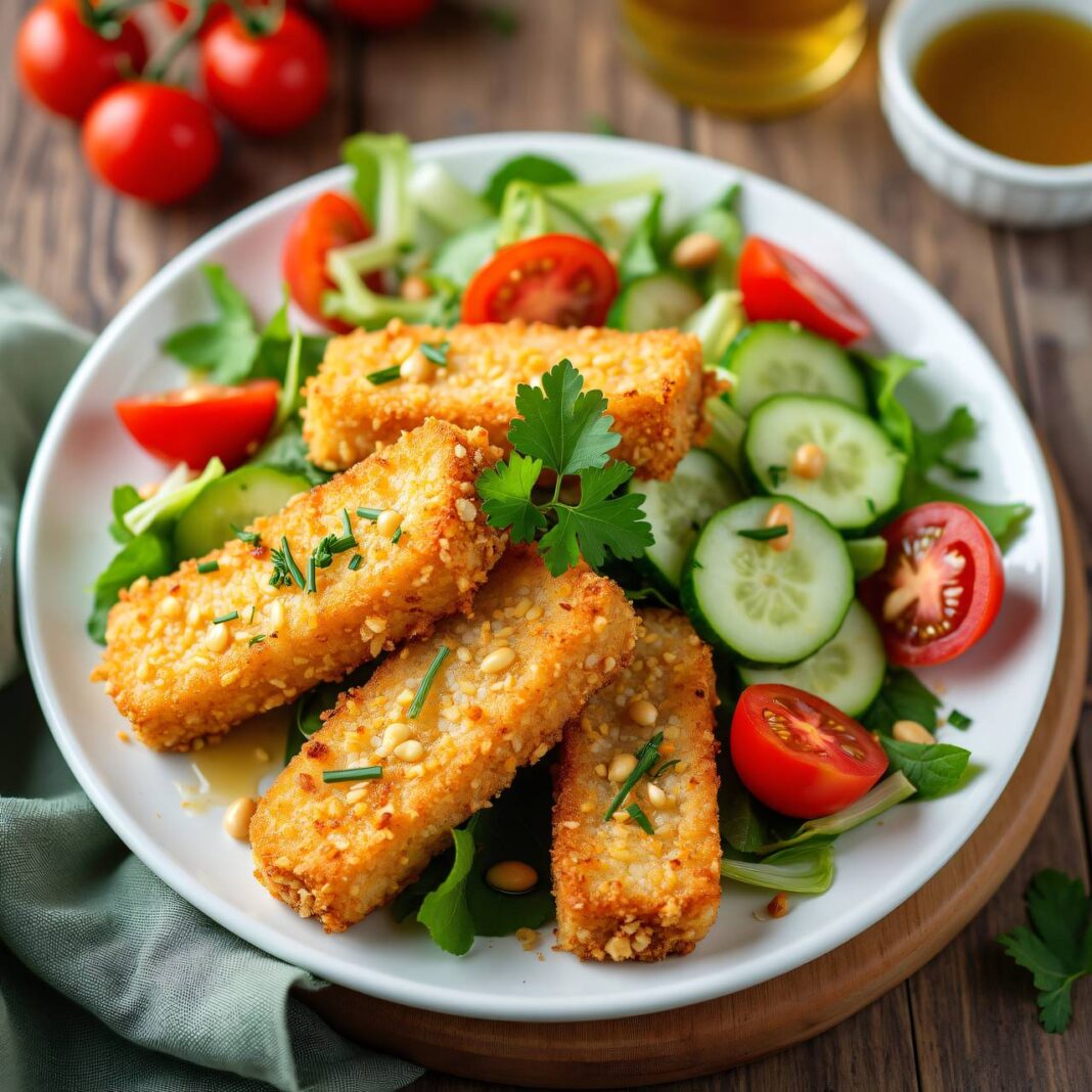 Knusprige Fisch-Sticks serviert auf einem bunten Salat mit frischen Zutaten.