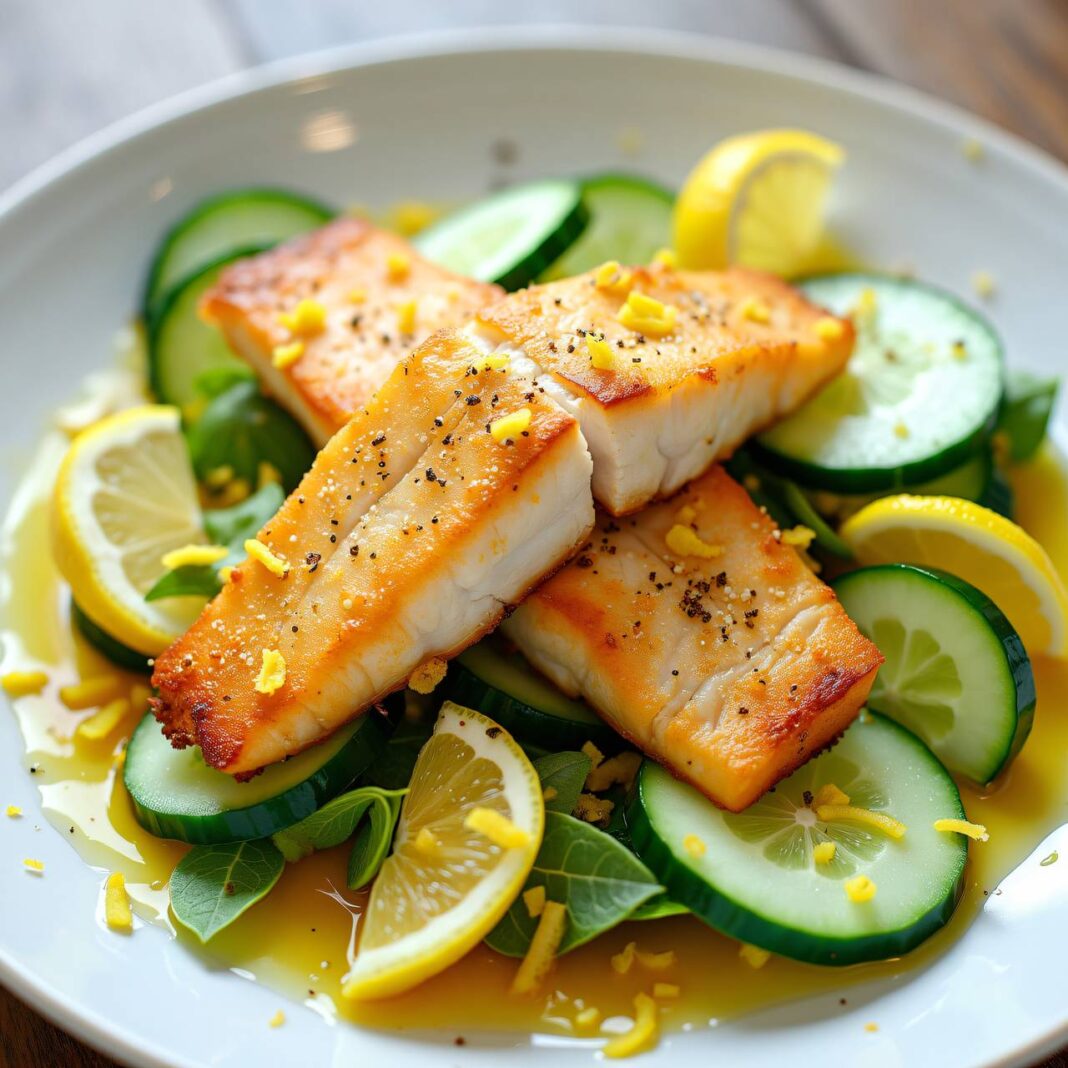 Ein erfrischendes Rezept mit zarten Fischfilets auf einem Bett aus Gurkensalat, verfeinert mit einer Zitronensauce.