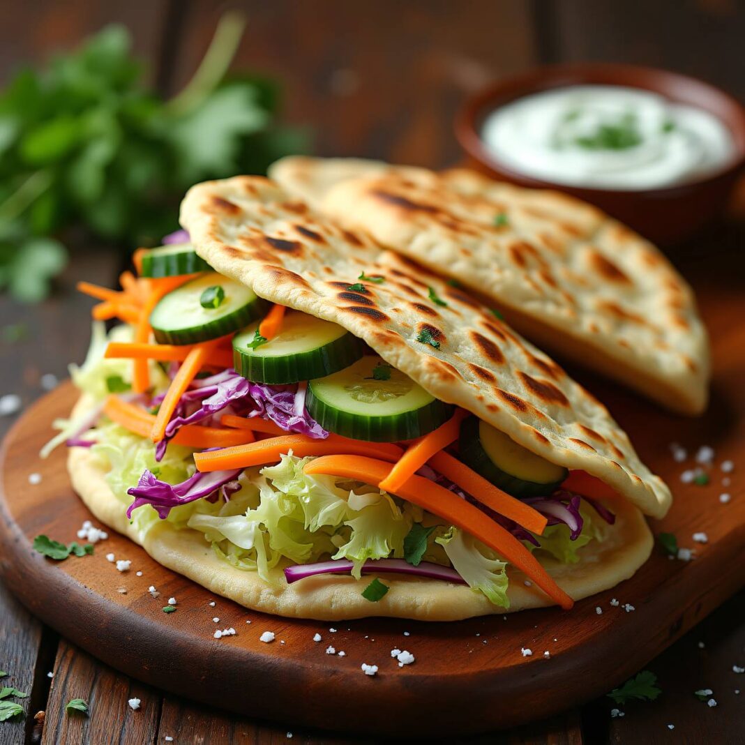 Ein leckeres Fladenbrot gefüllt mit frischem Gemüse und einem würzigen Korianderjoghurt.