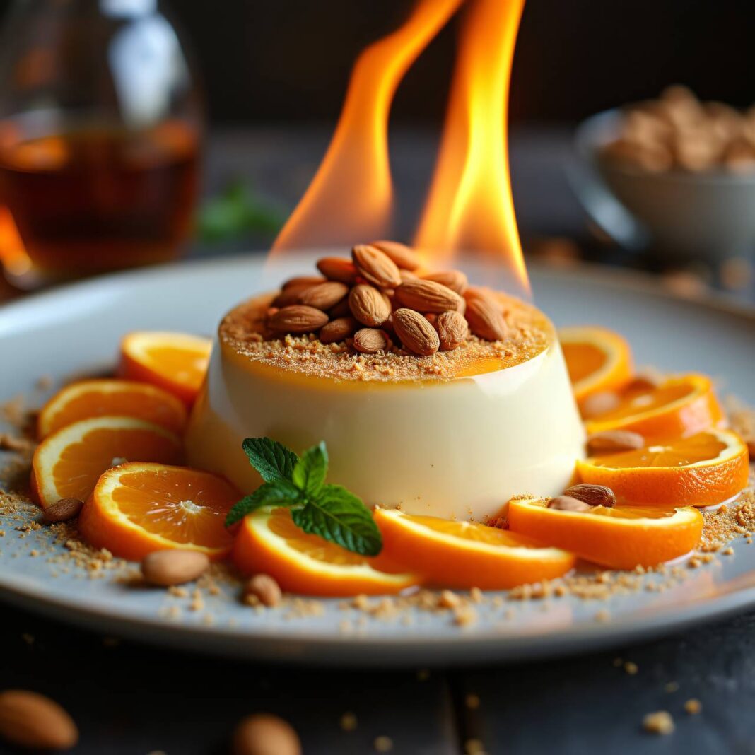 Ein köstliches, flambiertes Mandelparfait, das mit karamellisierten Mandeln und frischen Orangen serviert wird.
