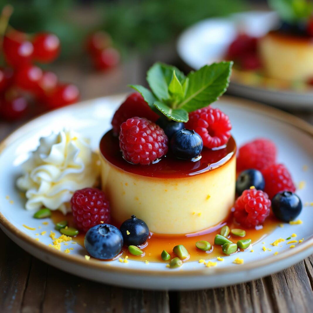 Ein köstlicher Flan, serviert mit marinierten Sommerbeeren und einer knusprigen Pistazien-Zucker-Mischung.