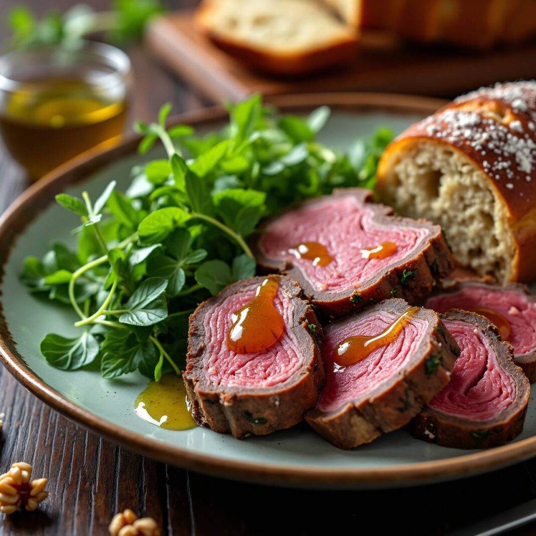 Ein köstliches Rezept für Fleisch mit einer aromatischen Schnittlauch-Nussöl-Vinaigrette, serviert mit frisch gebackenem Nussbrot.