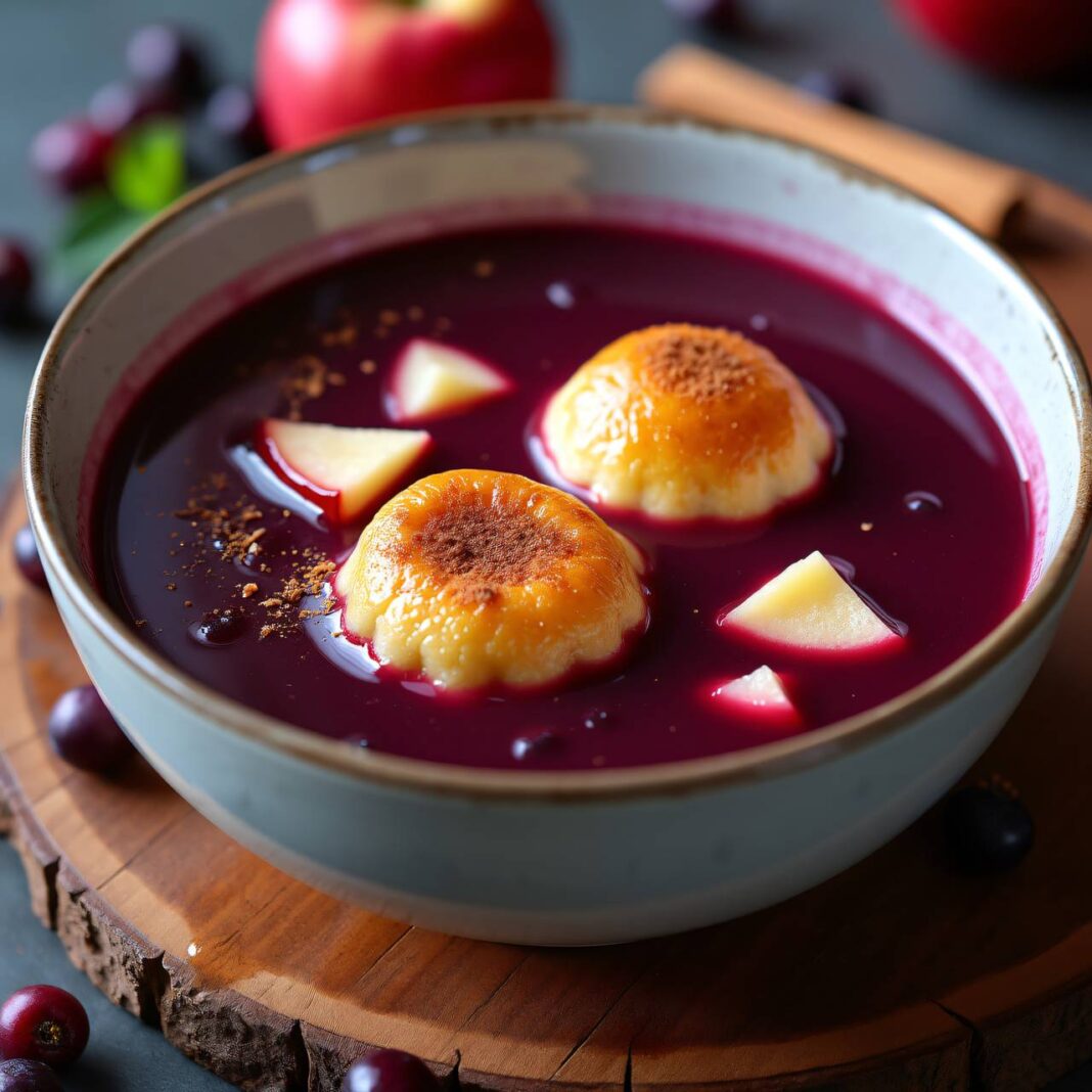 Eine köstliche Fliederbeersuppe serviert mit selbstgemachten Brandteigklößchen.