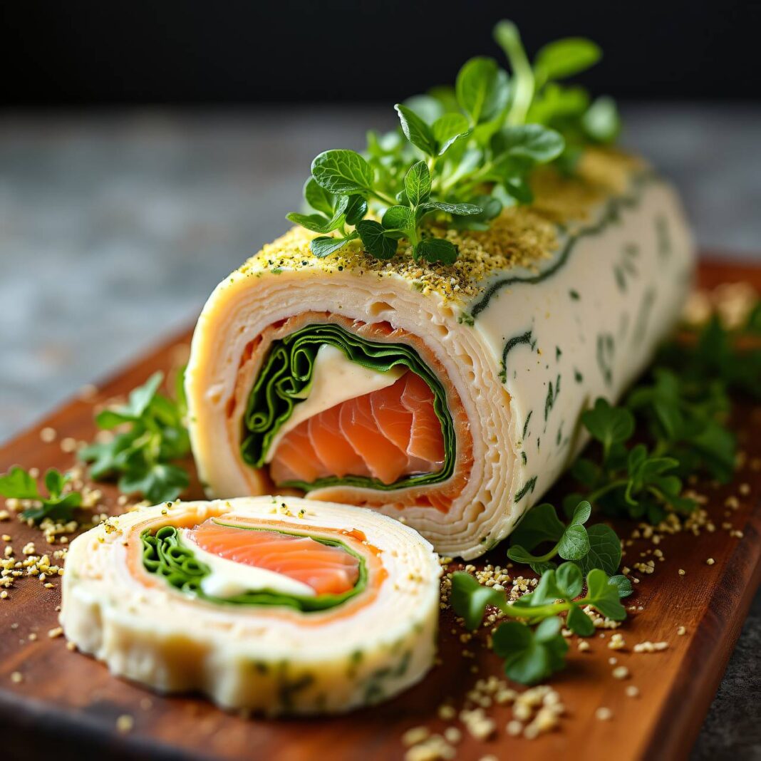 Eine köstliche Forellen-Terrine, die aus Lachsforellenfilets und geräucherten Forellenfilets besteht, eingewickelt in zarte Salatblätter.