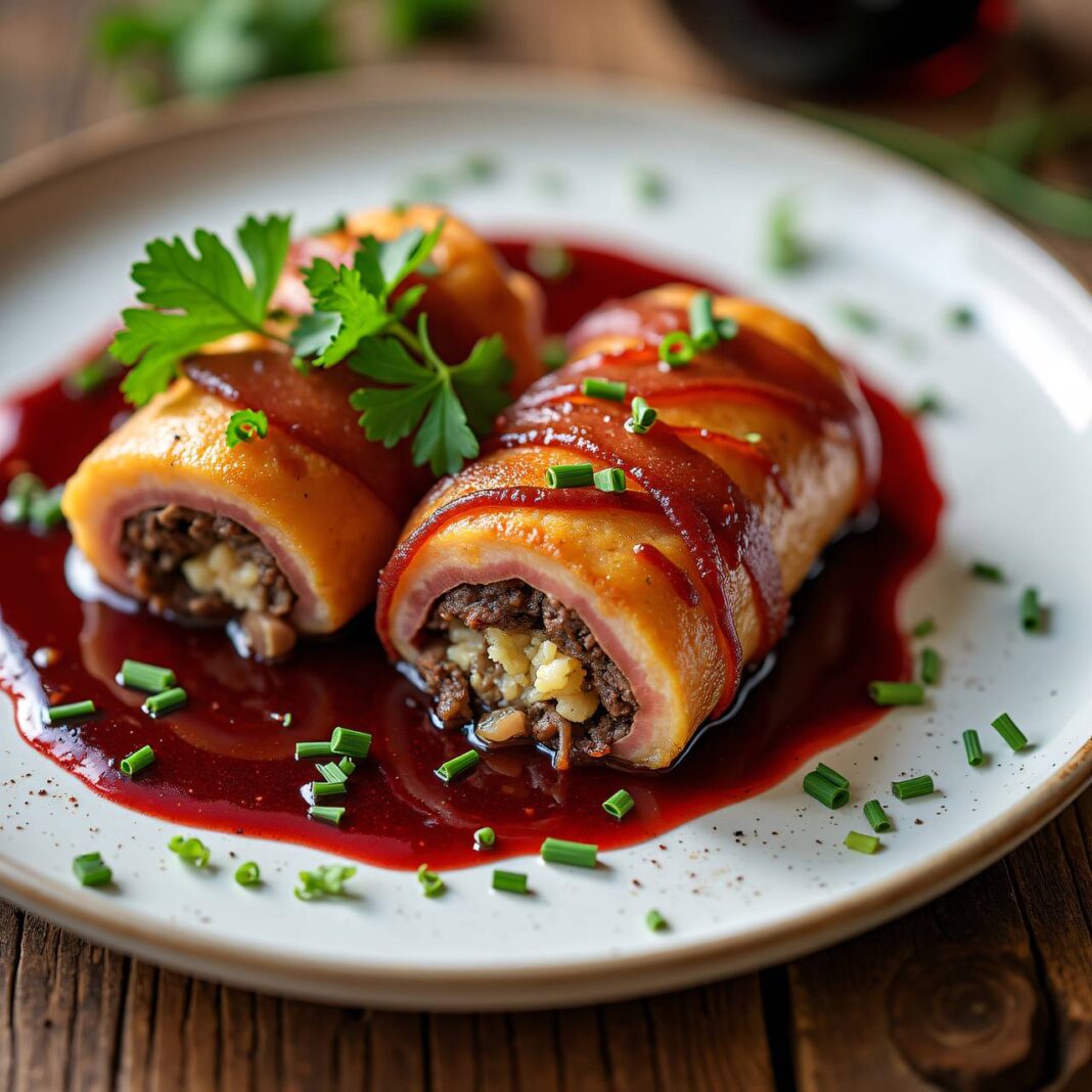 Ein klassisches Rezept für Fricandeaux, gefüllt mit einer köstlichen Mischung aus Schinken, Champignons und Gewürzen, serviert mit einer feinen Sauce.