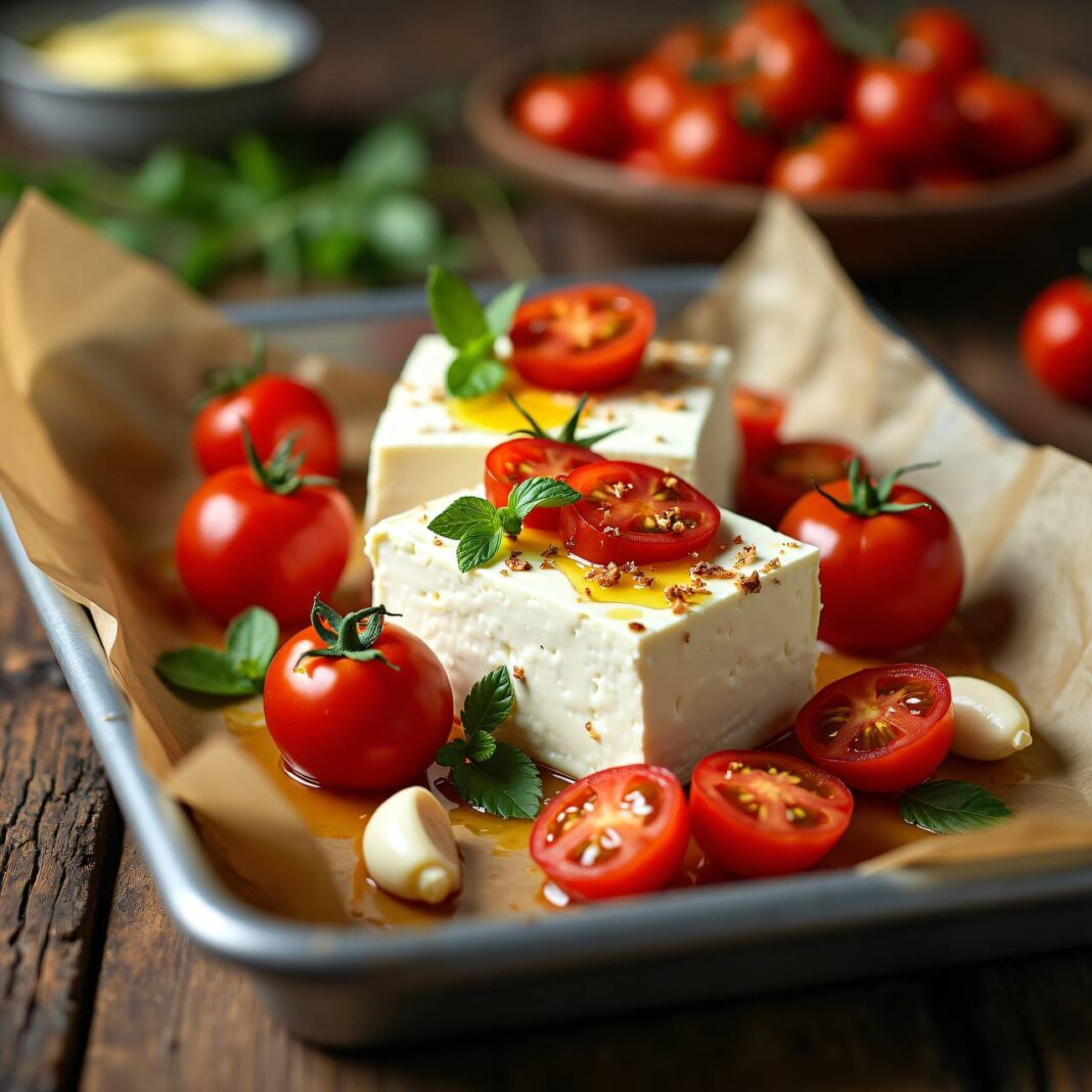Vorbereitung des Frischkäses: Schneide die Frischkäse-Blöcke in der Mitte durch und lege sie auf ein mit Backpapier ausgelegtes Blech. Verteile die Hälfte der Oreganoblättchen, die Paprikaringe und die Hälfte des Rapsöls gleichmäßig darüber.