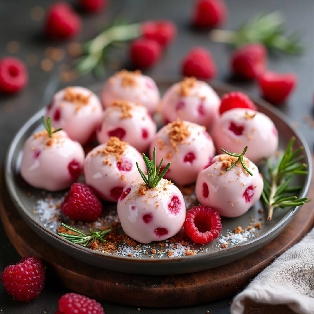 Leckere Frozen Yogurt Bites mit Rosmarin und Himbeeren, perfekt als erfrischender Snack.
