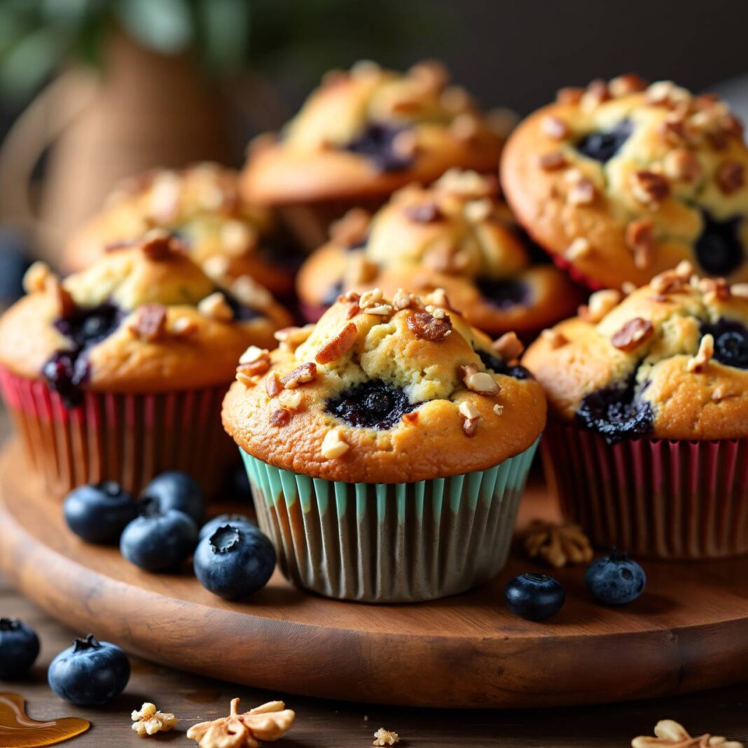 Leckere und gesunde Frühstücksmuffins mit Haferflocken, Chia-Samen und Heidelbeeren.