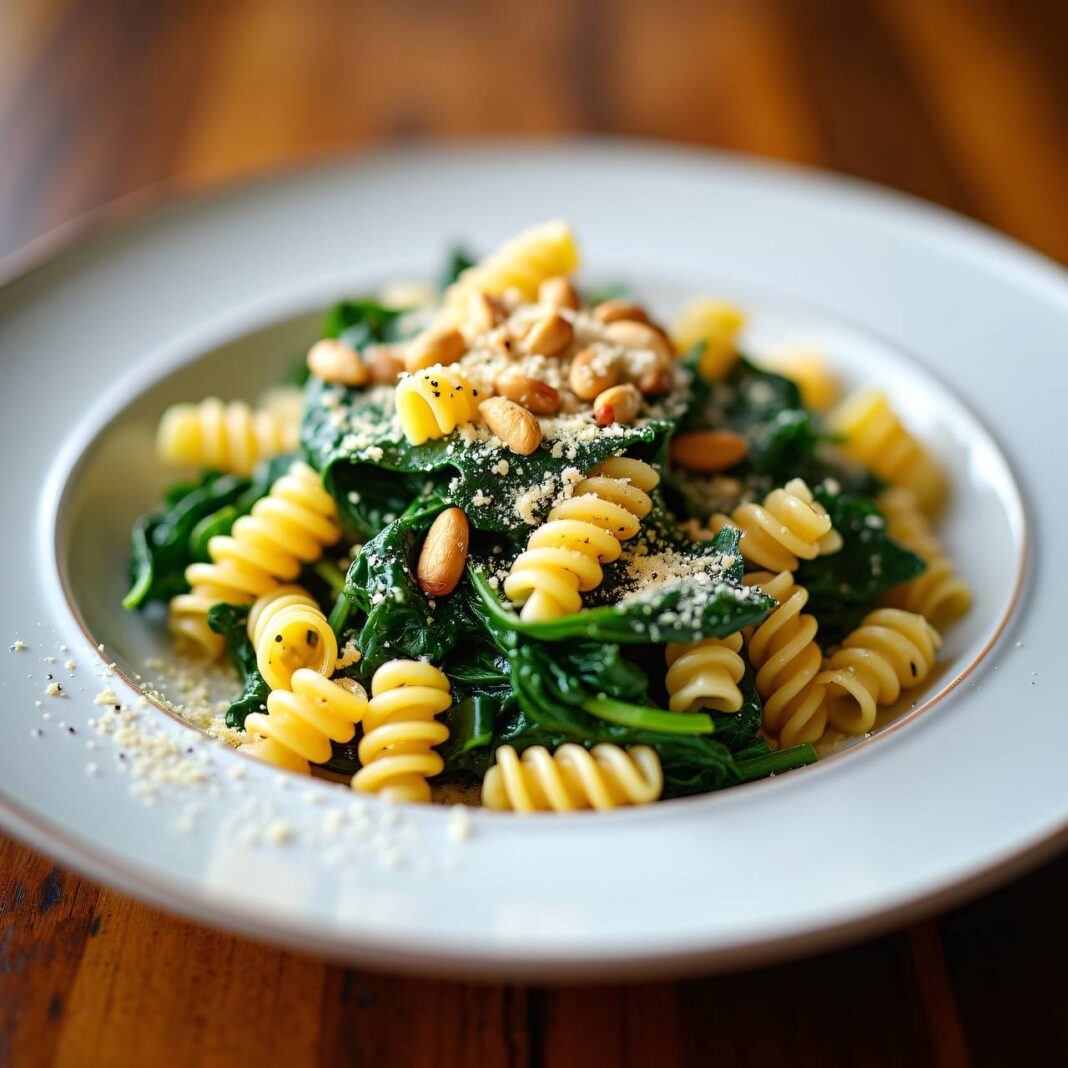Ein köstliches Rezept für Fusilli mit frischem Spinat, gerösteten Pinienkernen und Käse.