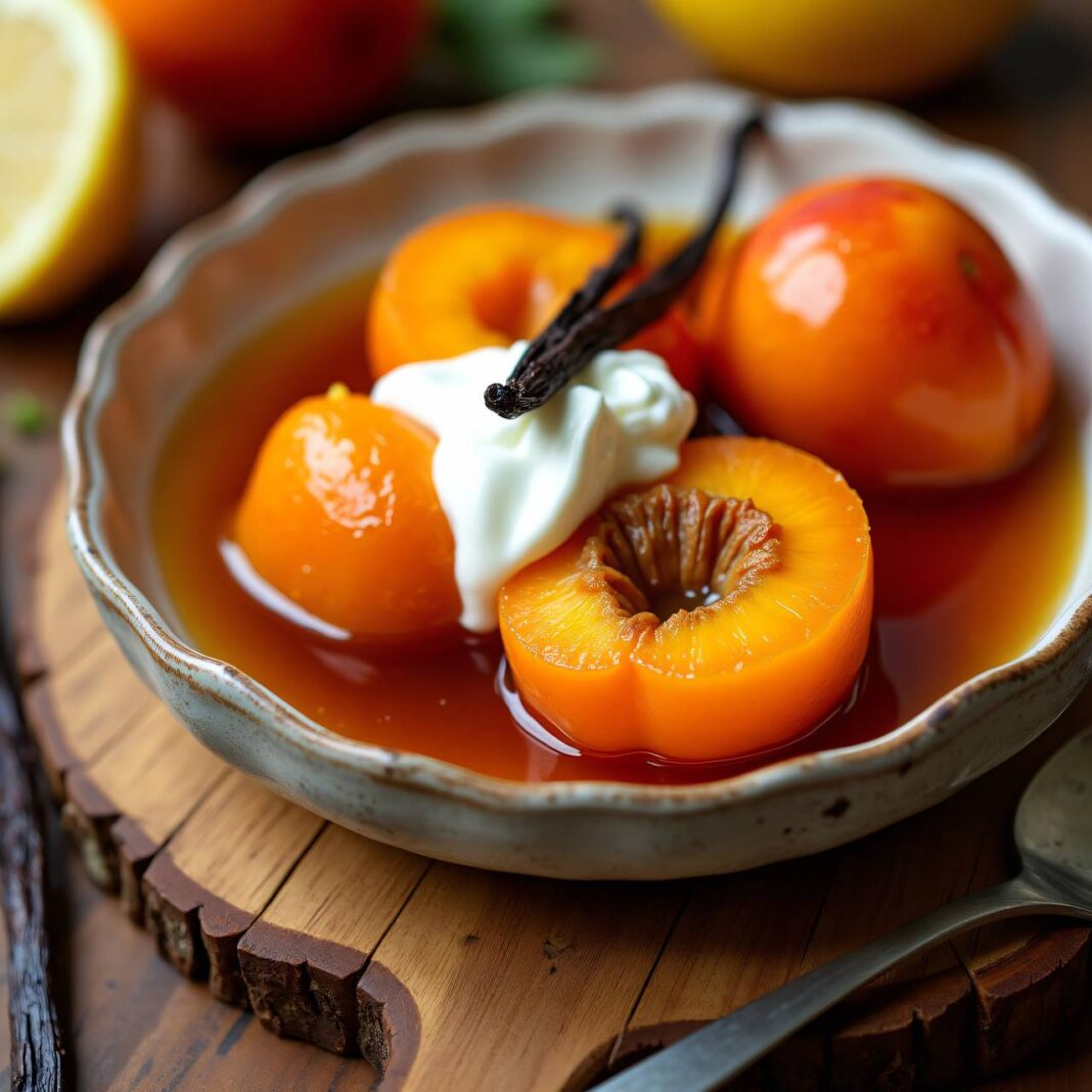 Ein köstliches Dessert aus ganzen Marillen, die in einem aromatischen Bittermandelsirup eingelegt und mit Crème fraîche serviert werden.