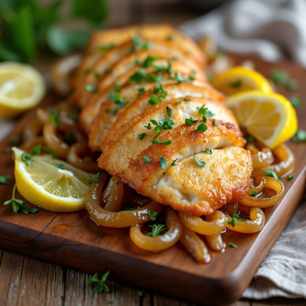 Ein köstliches Gericht aus gebratenem Fischfilet, serviert auf einem Bett aus aromatischem Zwiebelgemüse.