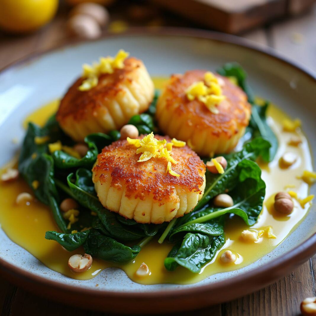 Ein köstliches Rezept für gebratene Käse-Quenelles auf einem Bett von Krautstiel, serviert mit aromatischer Zitronenbutter.