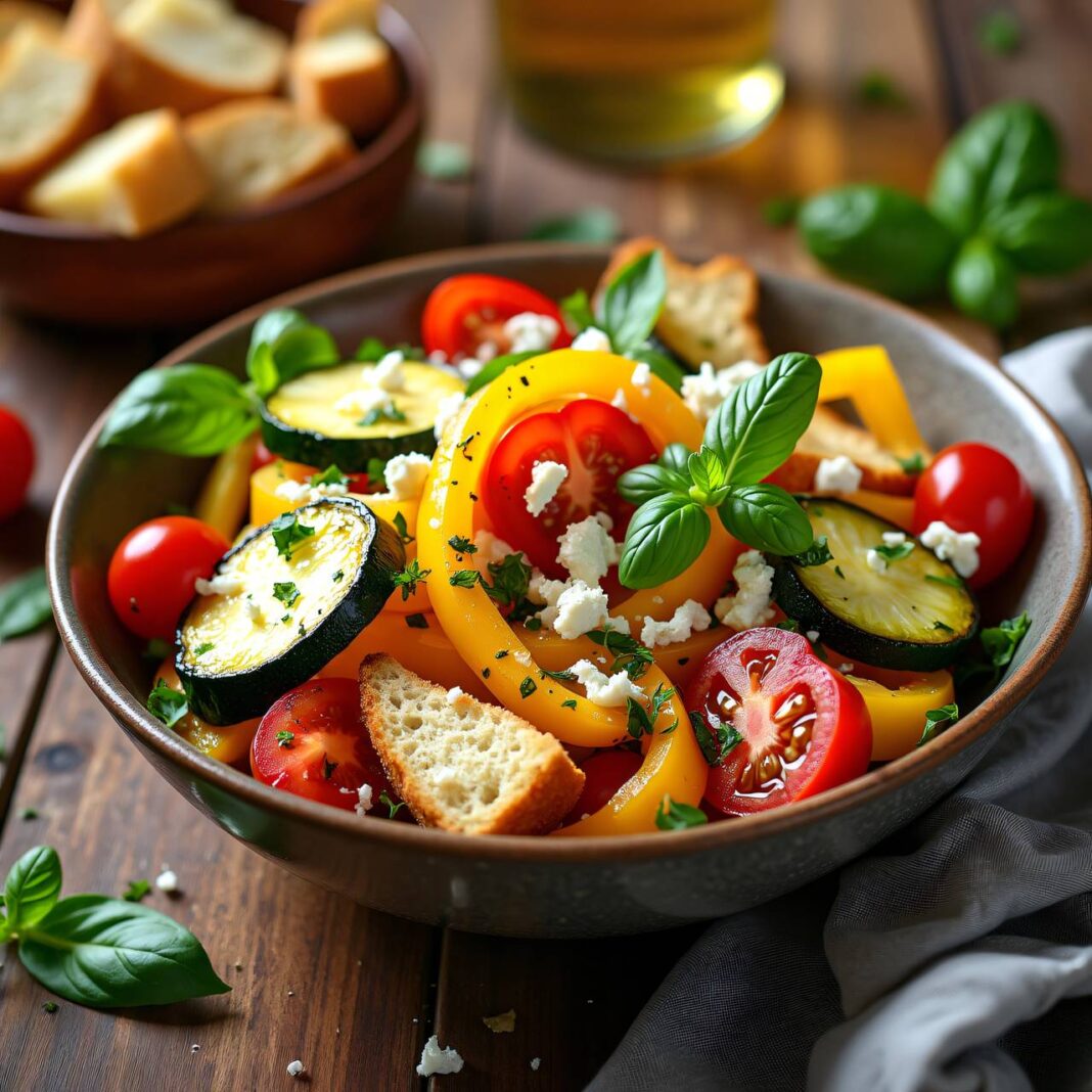 Ein köstlicher Salat aus gebratenem Gemüse und Brot, verfeinert mit Frischkäse und frischem Basilikum.