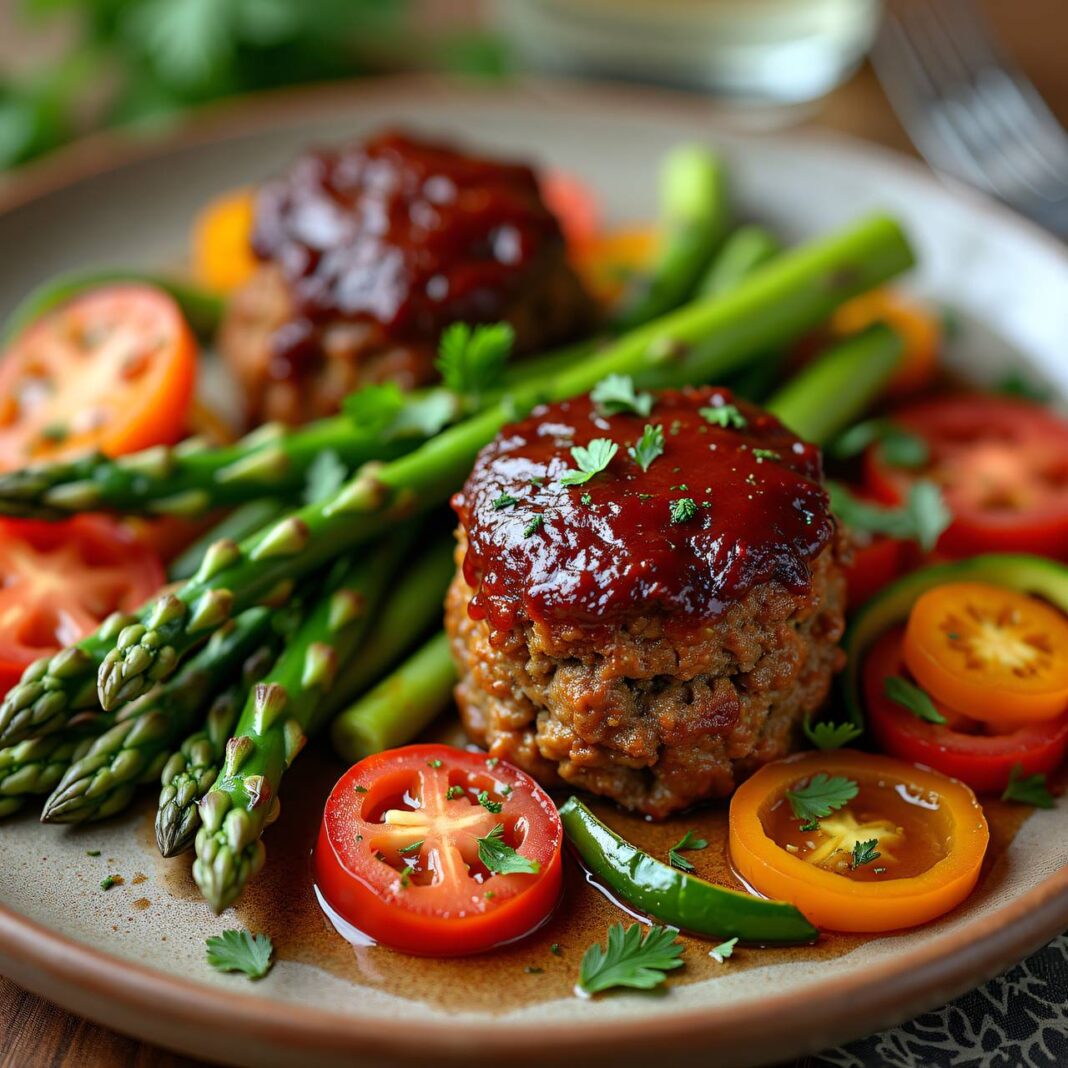 5. Anrichten: Nehmen Sie den Fleischlaib aus dem Ofen und lassen Sie ihn 5 Minuten ruhen. Entnehmen Sie das Gemüse, würzen Sie es nach Belieben und verteilen Sie die Spargel auf Tellern. Richten Sie das restliche Gemüse darauf an und bestreuen Sie es mit den gehackten Kräutern. Schneiden Sie den Fleischlaib in Scheiben und servieren Sie ihn dazu.