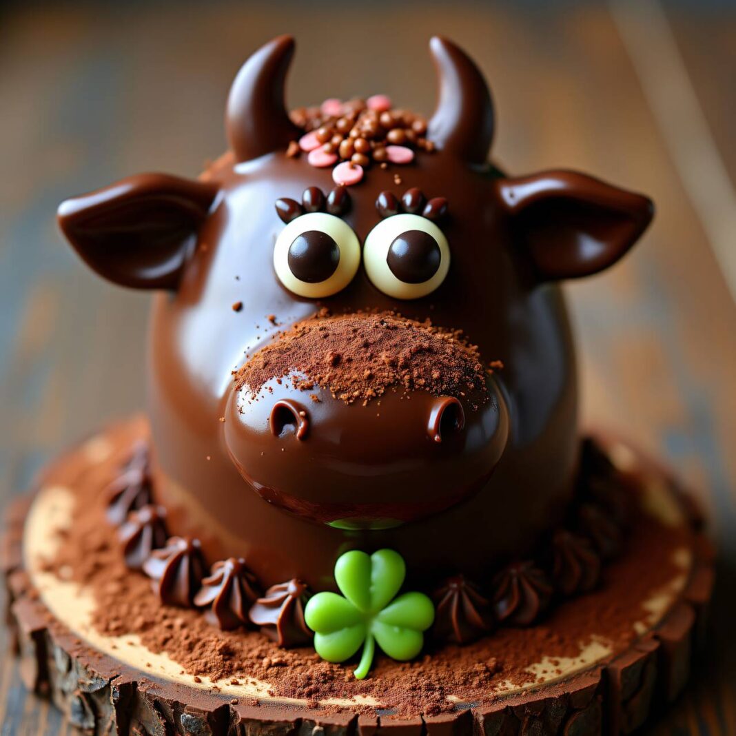 Kopf dekorieren: Den Kopf mit der dunklen Kuchenglasur bestreichen. Weiße Schokoladenstreusel als Fleck auf den Kopf streuen. Augen und Nasenlöcher anbringen. Mit dem Zuckerstift oder der Lakritze Wimpern formen. Das Kleeblatt seitlich am Maul anbringen.