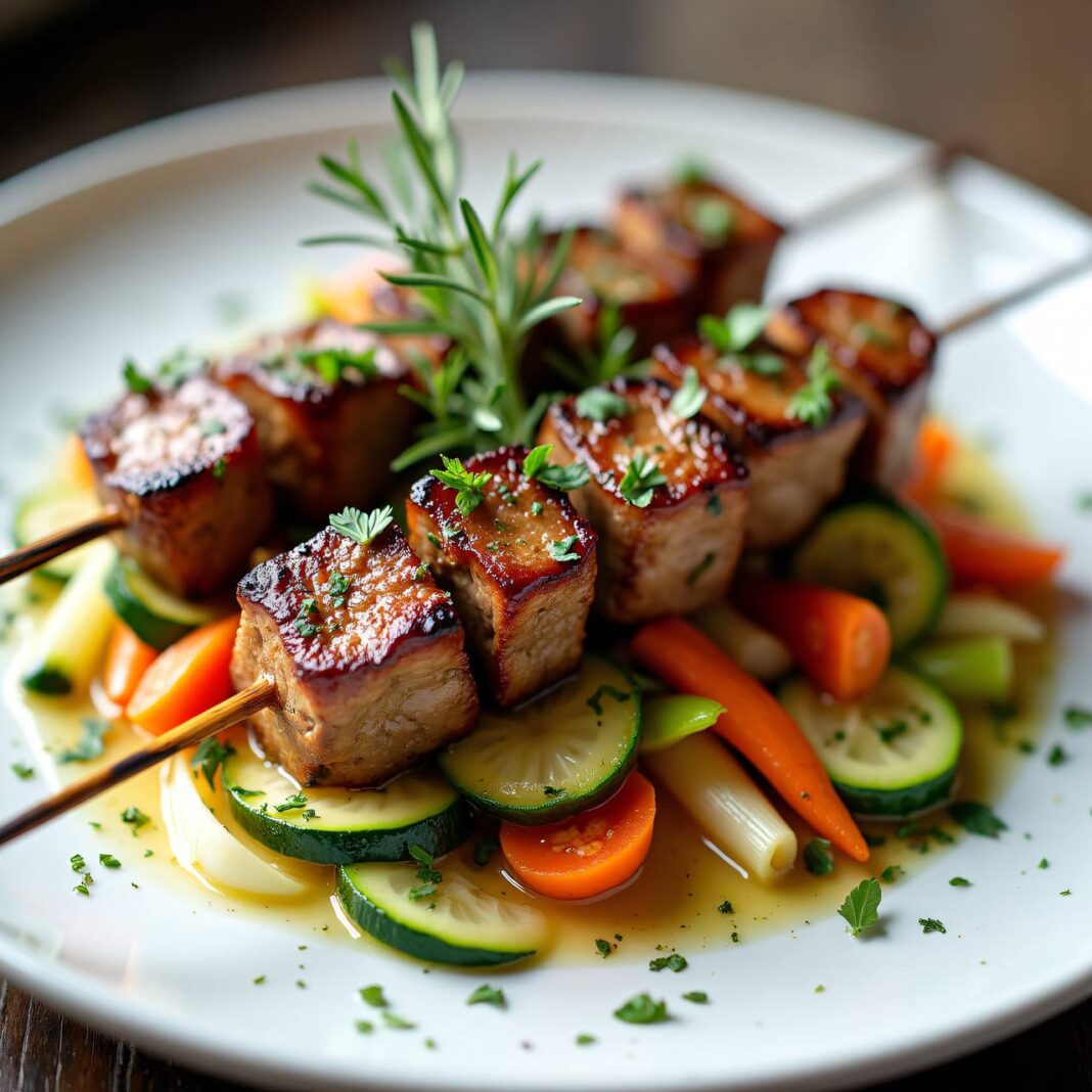 Ein köstliches Rezept für gedämpfte Kalbsspieße, serviert auf einem bunten Gemüse-Bett.