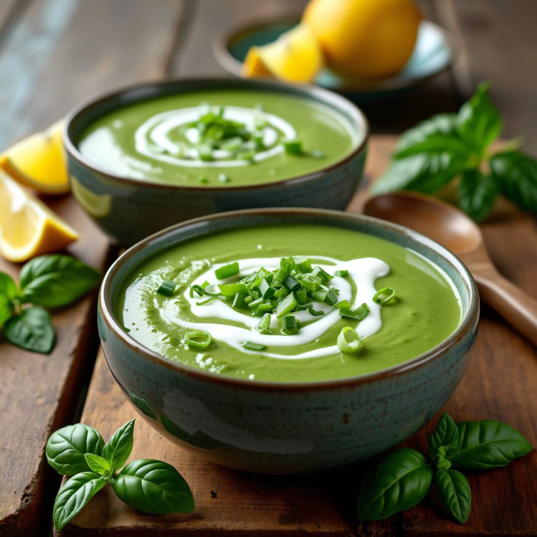Eine erfrischende, kalte Suppe mit Basilikum und Sauermilch, ideal für warme Tage.