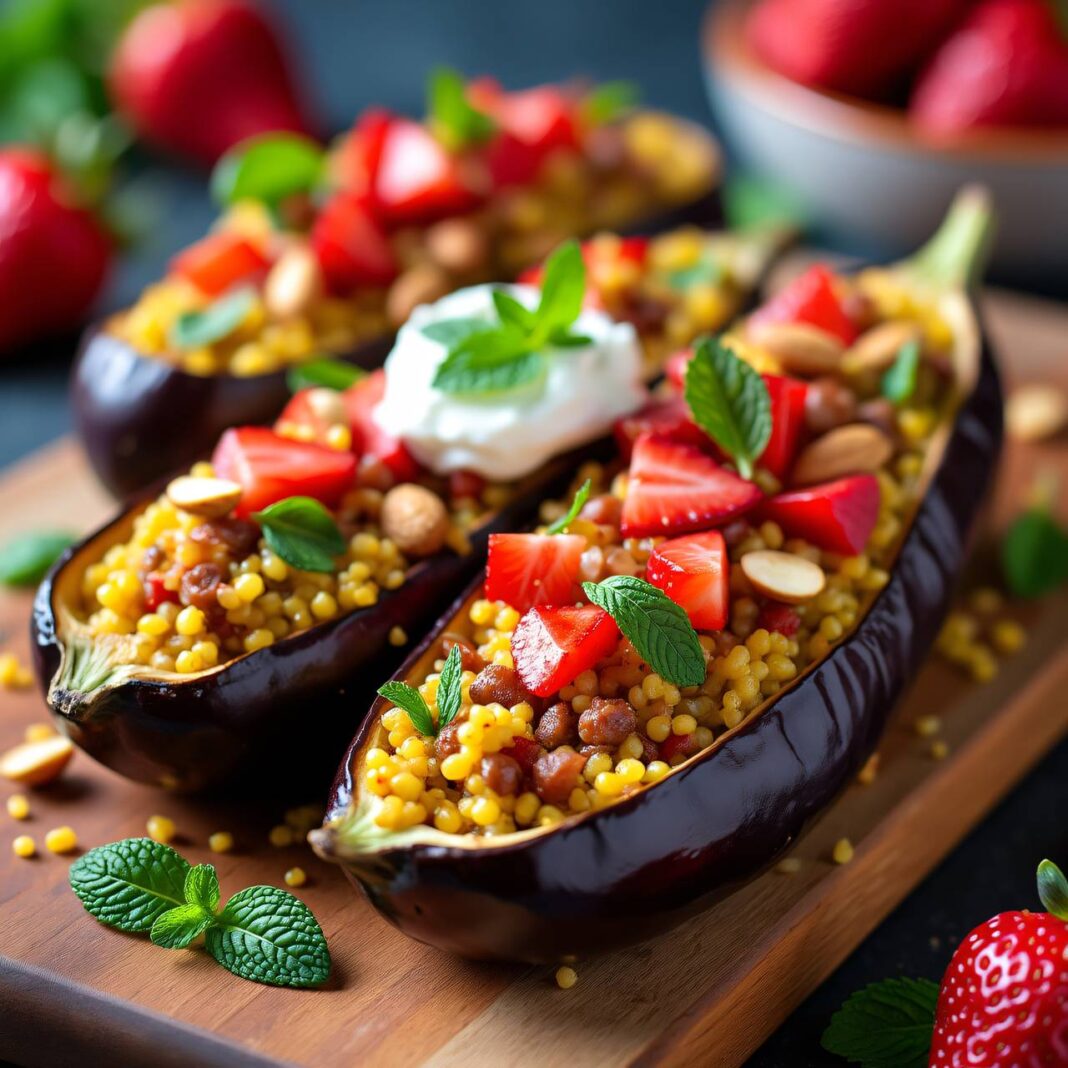 Ein köstliches Rezept für gefüllte Melanzani mit einer aromatischen Couscous-Füllung und frischen Erdbeeren.