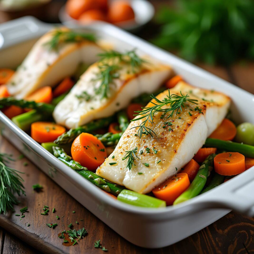 Zarte Fischfilets gefüllt mit Frischkäse und Dill, serviert auf einem aromatischen Gemüsebett aus Zwiebeln, Karotten und Spargel.