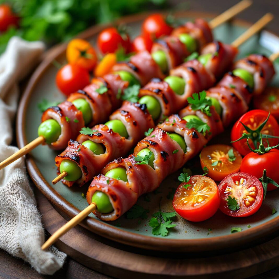 Ein köstliches Rezept für gefüllte Fleischspieße, serviert mit einem gebratenen Tomatensalat, ideal für den Grill.