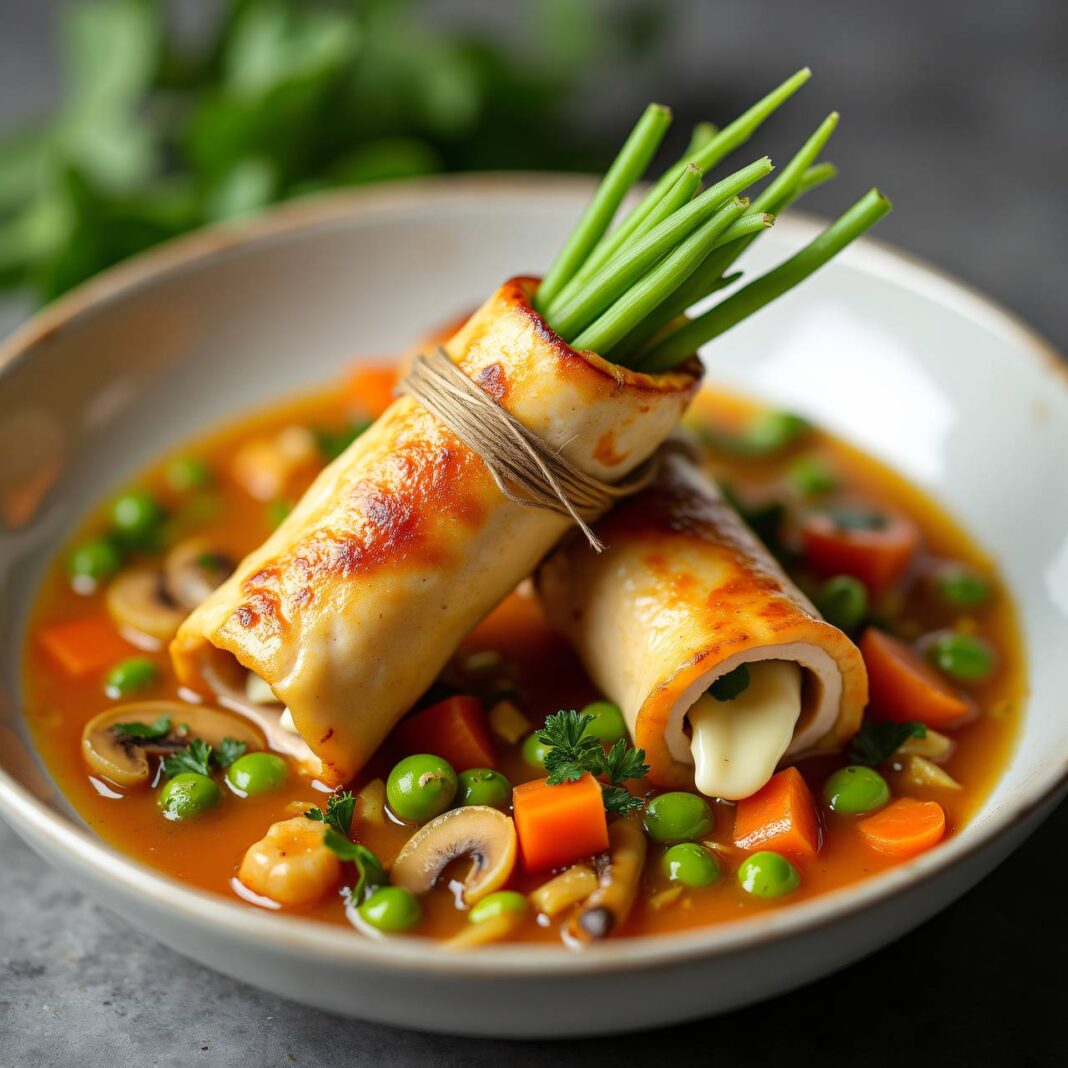 Saftige Hühnerröllchen gefüllt mit Rohschinken und Frischkäse, serviert mit einem aromatischen Gemüsecurry.