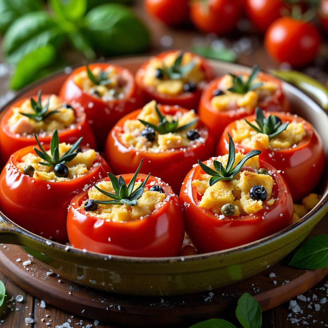 Leckere gefüllte Tomaten mit einer aromatischen Füllung aus Brot, Käse und Schinken, ideal für ein mediterranes Gericht.