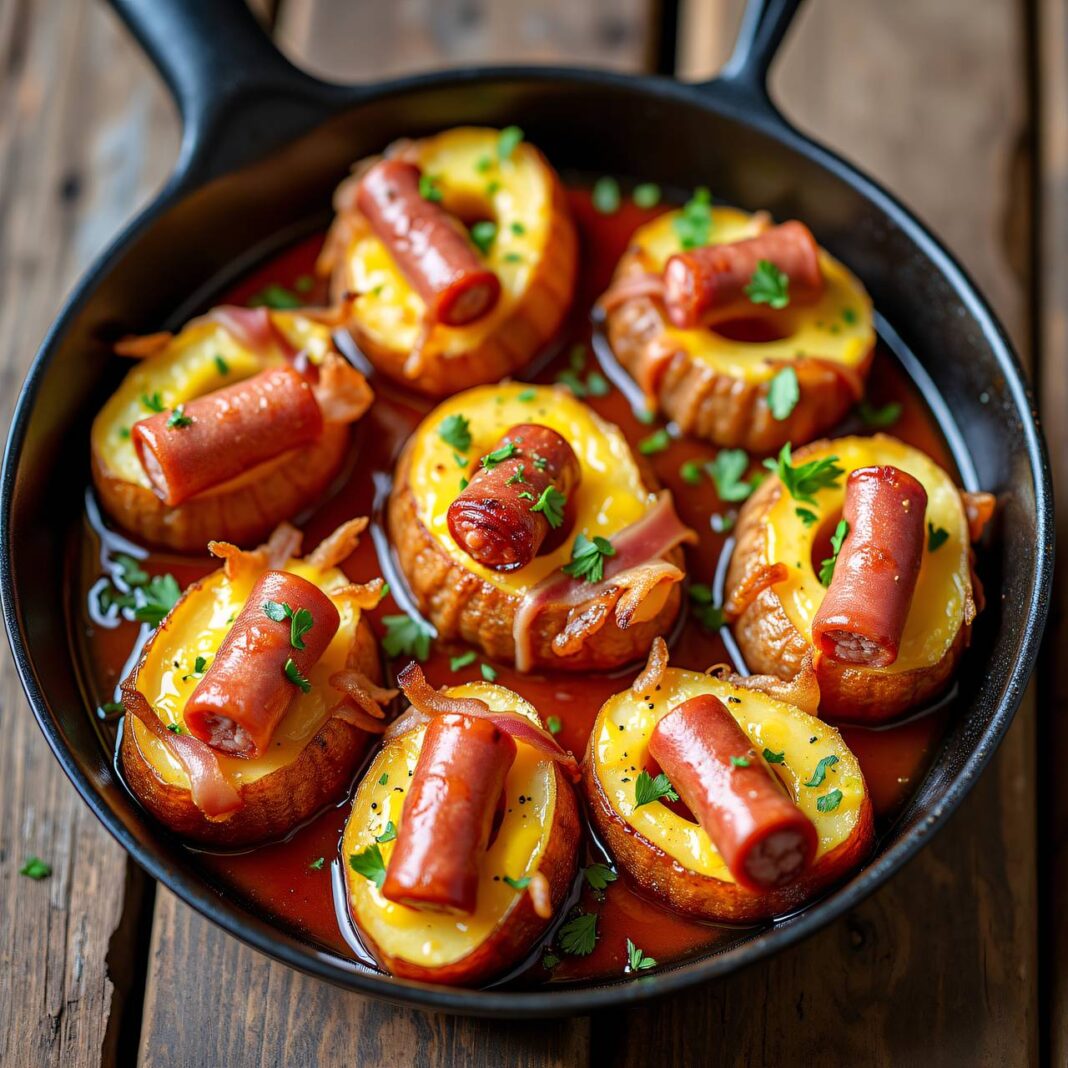 Ein köstliches Rezept für gefüllte Kartoffeln mit Wurst und Käse, umwickelt mit Frühstücksspeck.