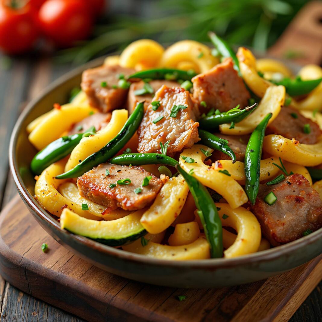 Eine köstliche Gemüse-Pfanne mit Schweinegeschnetzeltem und Spätzle, perfekt für ein schnelles und gesundes Gericht.