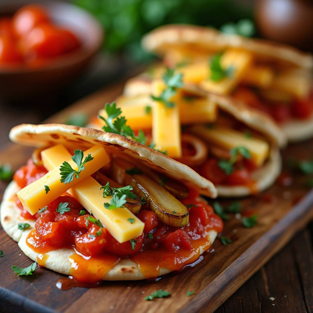 Leckere Gemüse-Pitas gefüllt mit einer aromatischen Sauce, gedämpftem Gemüse und Raclettekäse, überbacken mit karamellisierten Zwiebeln.