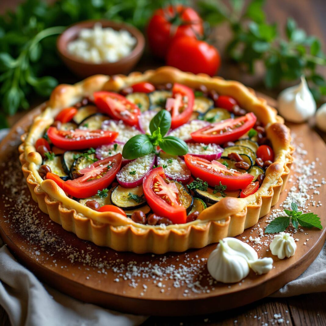 Ein köstlicher Gemüseblechkuchen mit frischem Gemüse und Hüttenkäse, ideal für jede Gelegenheit.