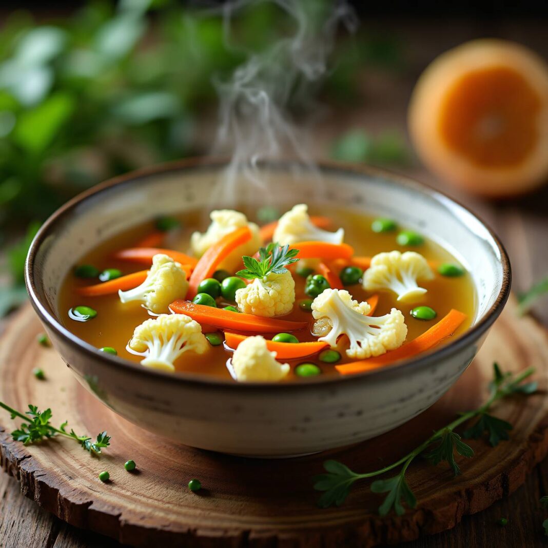 Eine gesunde und schmackhafte Gemüsebouillon, die mit frischem Blumenkohl und Karotten zubereitet wird.