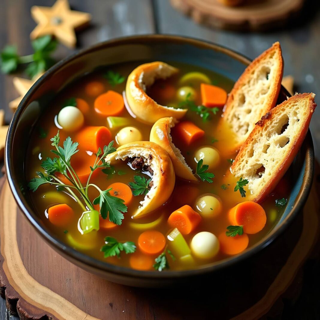 Eine köstliche Gemüsebouillon serviert mit zarten Trüffelhalbmonden.