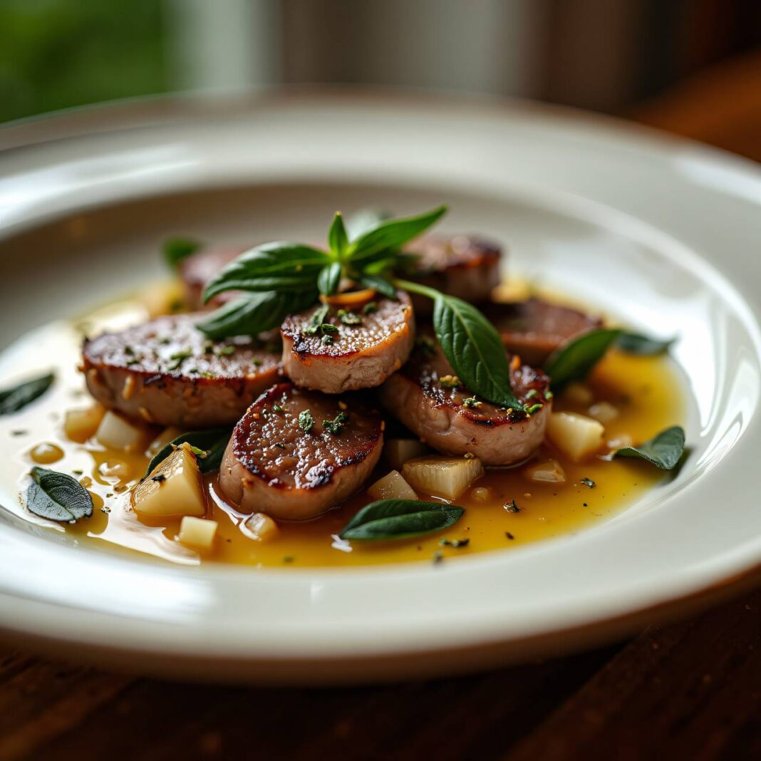 Ein schmackhaftes Gericht aus zarter Kalbsleber, verfeinert mit Salbeibutter und gedünsteten Schalotten.