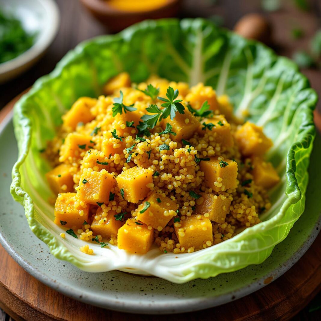 Ein schmackhaftes Rezept für Gewürzbulgur, serviert in frischen Kohlblättern.