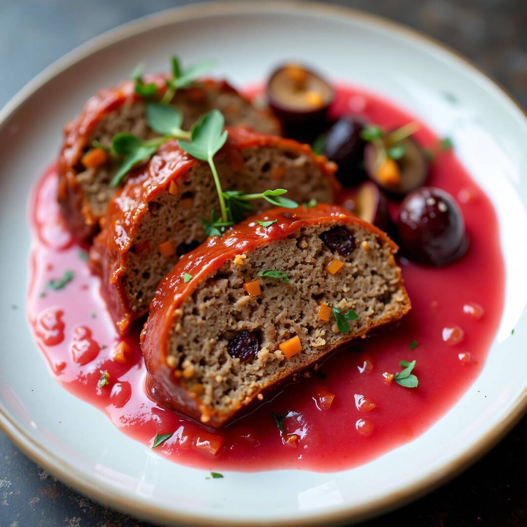 Ein saftiger Hackbraten mit einer süßen Rhabarbersauce, perfekt für ein herzhaftes Abendessen.