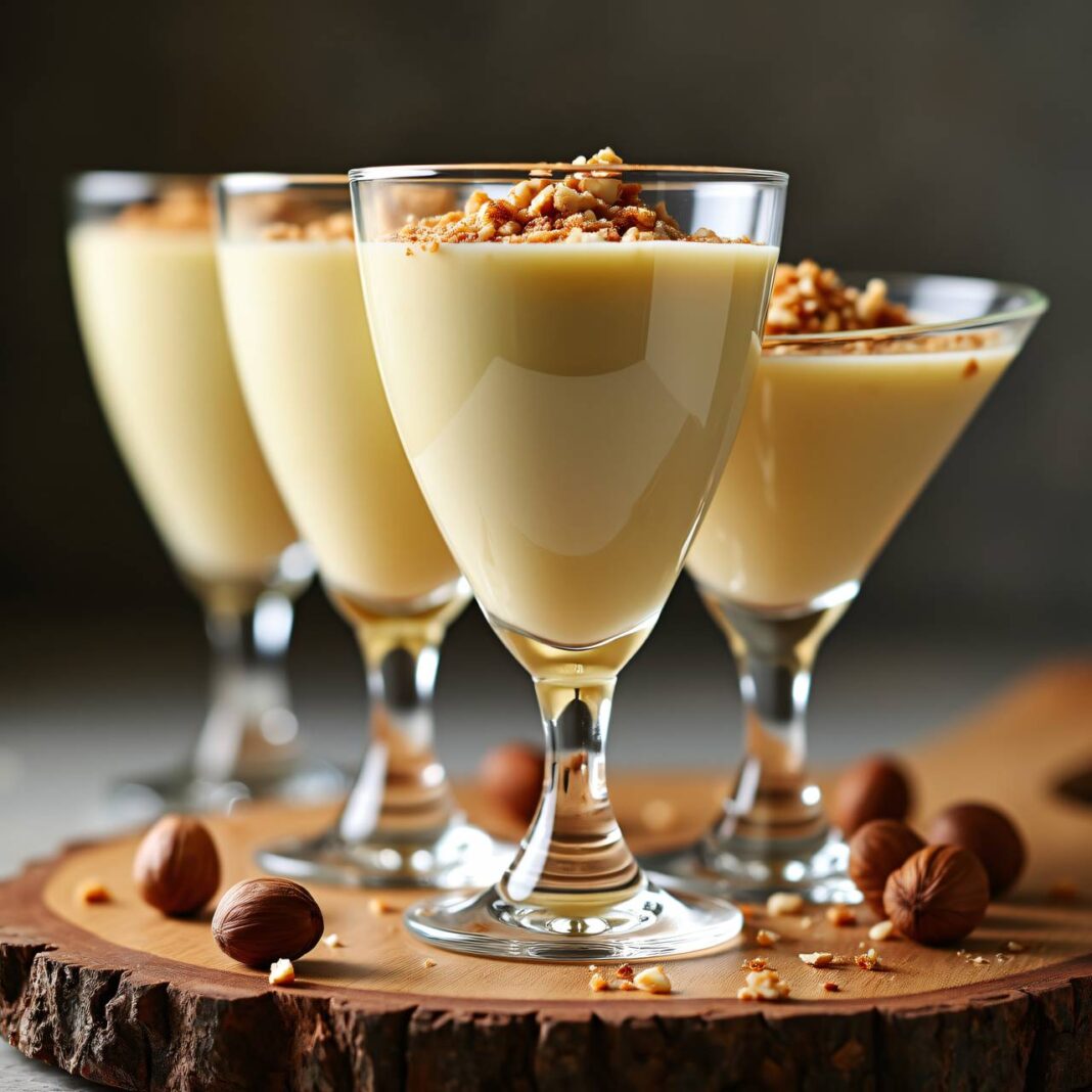 Ein köstliches Dessert aus geschlagenen Eiern, Zucker, Rum oder Cognac und steif geschlagenem Obers, garniert mit gerösteten Haselnüssen.