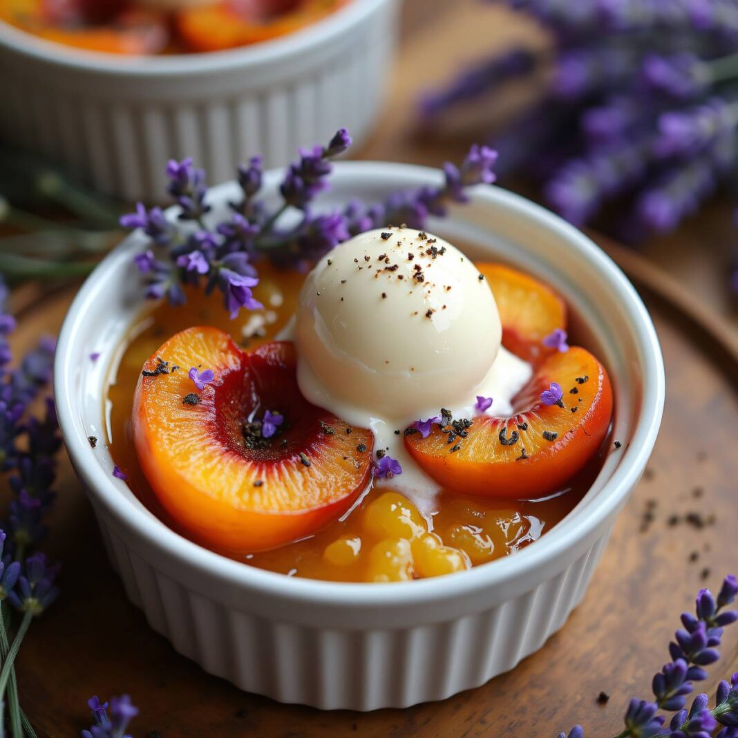 Ein köstliches Dessert aus gratinierten Pfirsichen, verfeinert mit Lavendelhonig und serviert mit einem rosa Pfeffer-Vanilleeis.