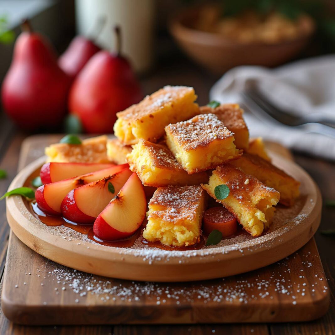 Ein köstliches Rezept für Griess-Kaiserschmarrn, serviert mit süßen roten Birnen in einem aromatischen Sud.