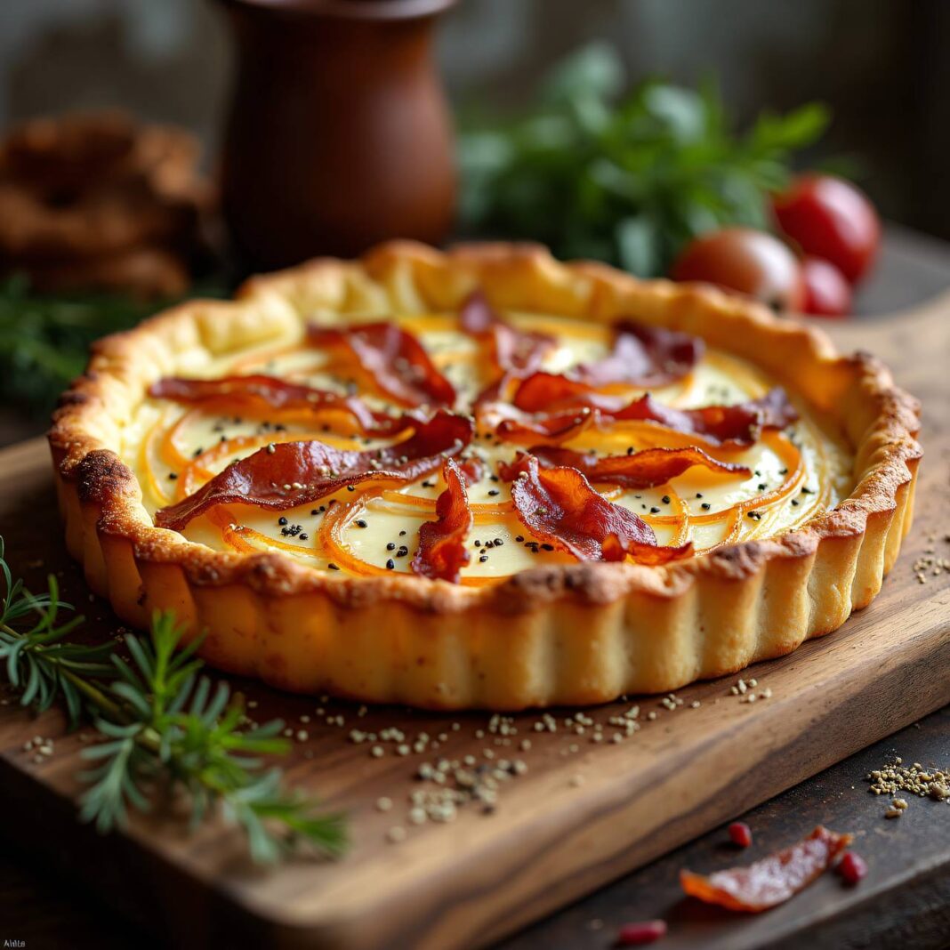 Ein traditioneller Zwiebelkuchen, der mit einer köstlichen Mischung aus Zwiebeln, Speck und Gruyère-Cheese zubereitet wird.