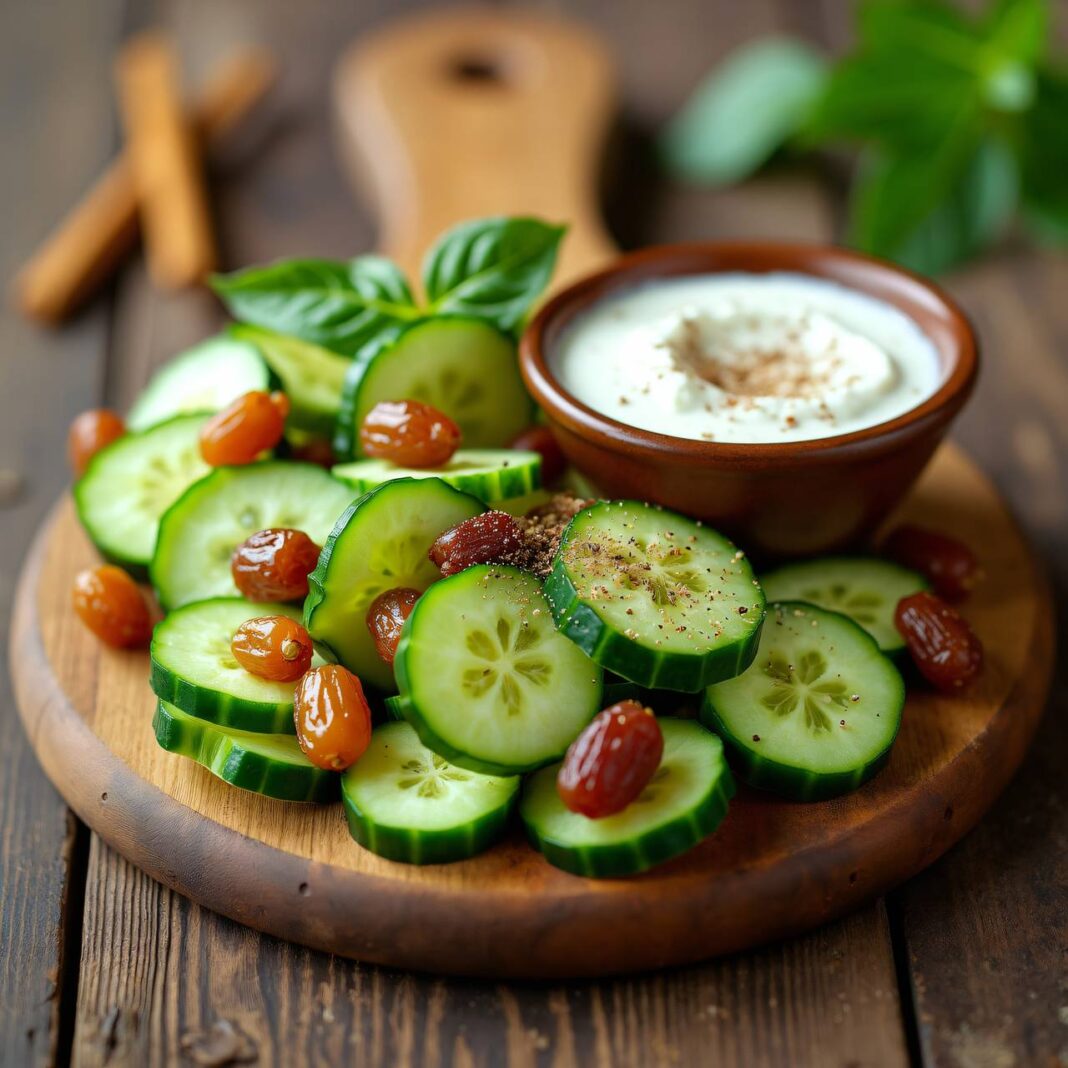 Ein erfrischender Gurken-Sultaninen-Salat mit einer leckeren Joghurt-Sauce.