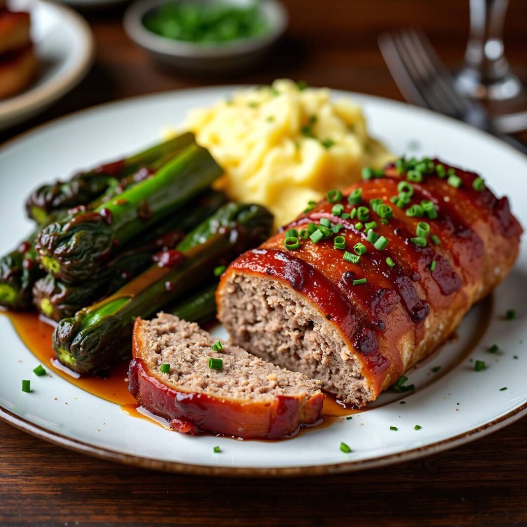 Ein saftiger Hackbraten umhüllt von knusprigem Frühstücksspeck, serviert mit Senf-Kartoffelpüree und buntem Mangold.