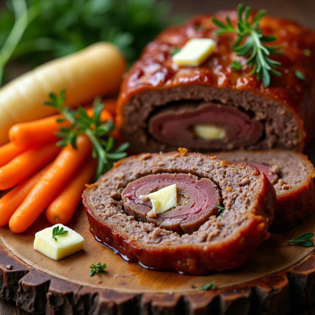 Ein herzhaftes Rezept für Hackbraten, serviert mit gedämpften Karotten.