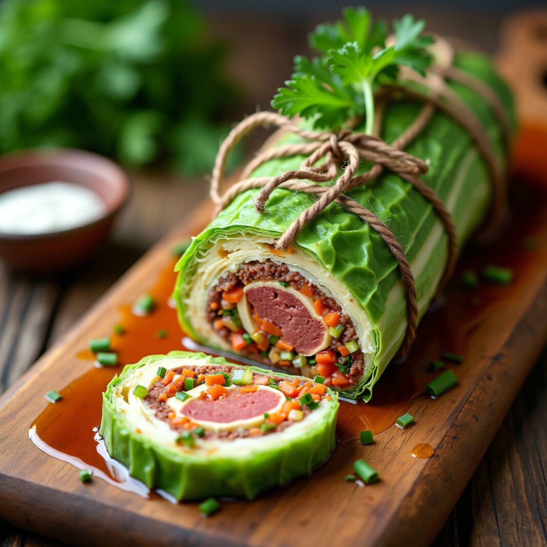 Eine köstliche Roulade aus Hackfleisch, eingewickelt in zarte Kohlblätter und serviert mit einer cremigen Sauce.